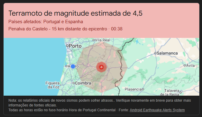 De acordo com a informação preliminar disponível, o abalo ocorreu pelas 00h38 e teve epicentro a cerca de 15 quilómetros de Penalva do Castelo, no distrito de Viseu. O fenómeno foi inicialmente assinalado pelo sistema Android Earthquake Alerts, que indica uma área alargada de perceção do sismo.