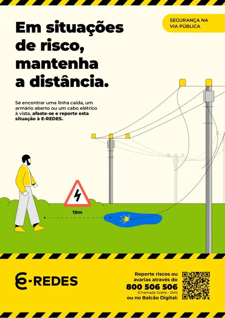 Em caso de encontrar uma linha caída no chão, a recomendação é clara: manter uma distância mínima superior a 10 metros e assumir que todos os cabos e equipamentos estão ativos. A empresa reforça que não se deve tocar, nem tentar afastar cabos ou linhas com qualquer objeto, devendo o afastamento ser feito com passos curtos, de forma a reduzir o risco de choque elétrico.