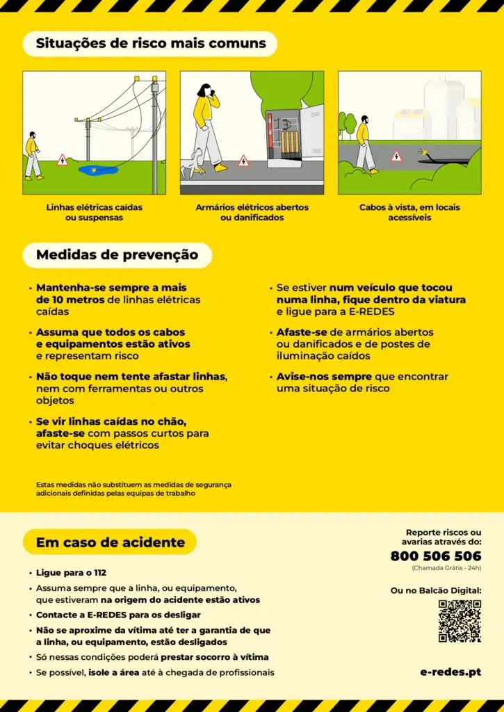 A E-REDES alerta igualmente para o perigo de armários elétricos abertos ou danificados e de postes de iluminação caídos, sublinhando a importância de se afastar imediatamente destas situações e de comunicar a ocorrência.