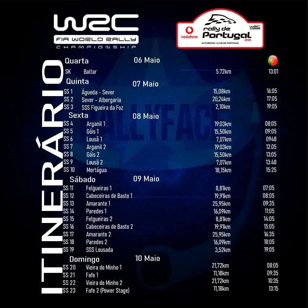 O Rally de Portugal 2026 decorre entre 6 e 10 de maio, atravessando vários municípios do país. Após a passagem pela região Centro na quinta e sexta-feira (com especiais em Arganil, Góis, Lousã e Mortágua), a prova prossegue para o Norte, com classificativas em Felgueiras, Cabeceiras de Basto, Amarante, Paredes e Lousada, culminando no domingo, 10 de maio, com as especiais de Vieira do Minho e Fafe, incluindo a Power Stage.