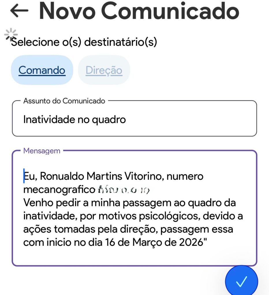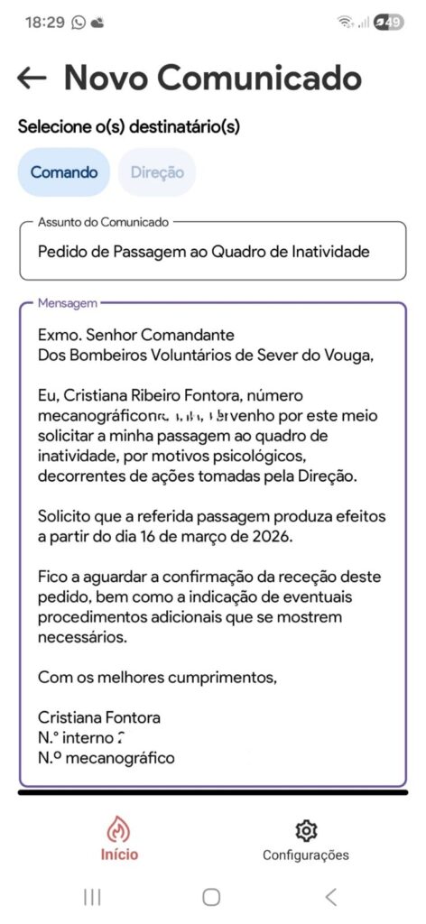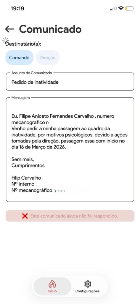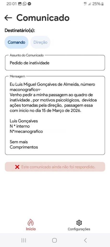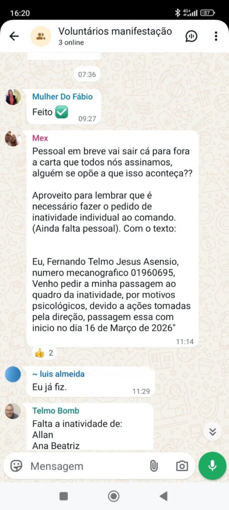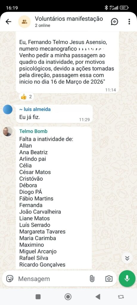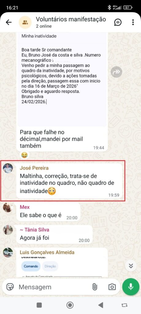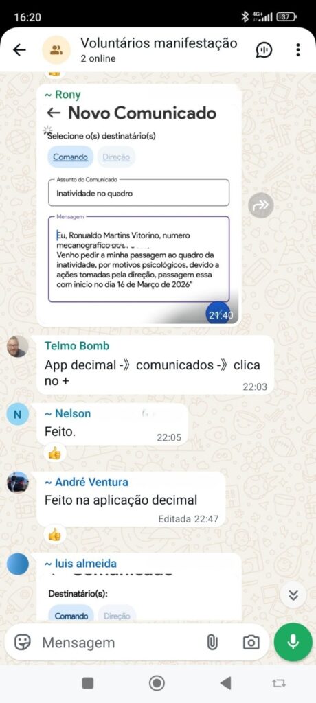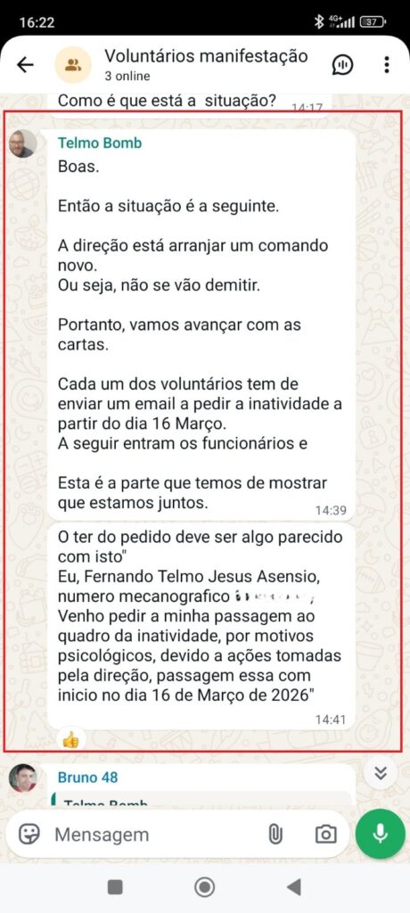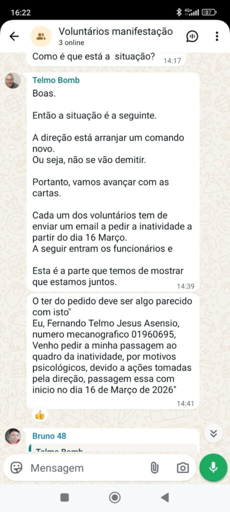 Entre os conteúdos agora tornados públicos encontram-se mensagens que apontam para a apresentação de pedidos formais de passagem à inatividade com efeitos a partir de 16 de março de 2026. Nas conversas partilhadas, é referido um modelo de texto a utilizar nesses pedidos, que justificaria a decisão com “motivos psicológicos decorrentes de ações tomadas pela direção”.