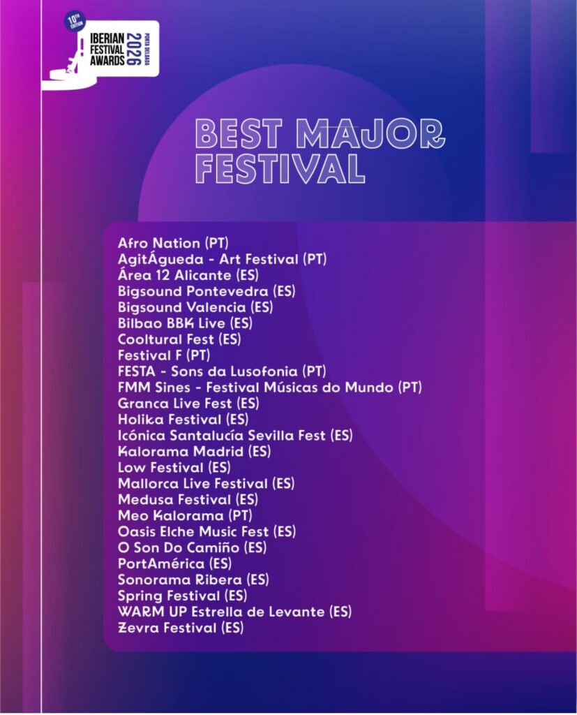 Já na categoria Best Major Festival, onde estão presentes alguns dos maiores festivais da Península Ibérica, o AgitÁgueda surge ao lado de eventos de grande dimensão como Bilbao BBK Live, Kalorama Madrid, Medusa Festival, O Son do Camiño ou FMM Sines – Festival Músicas do Mundo, reforçando o reconhecimento internacional do festival aguedense.